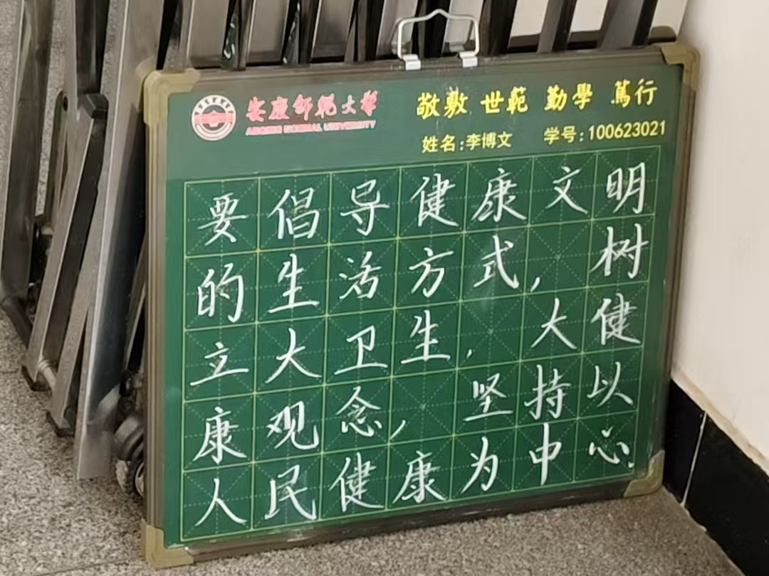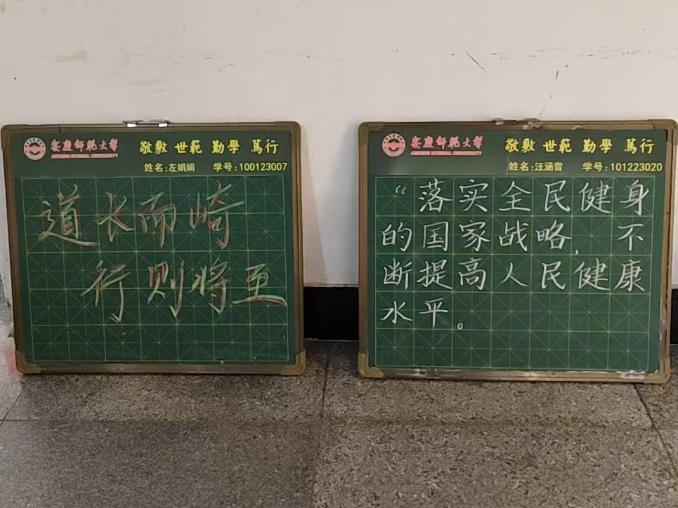 7#宿舍楼功能型党支部联合未来教育家协会,围绕习近平总书记关于“体育是提高人民健康水平的重要手段”、“健康是1,其他是后面的0”等重要论述,以小黑板为“画布”,用粉笔勾勒体育精神的生动图景。“文明其精神,野蛮其体魄”的重要论述苍劲有力,与“生命在于运动”的健康理念、“拼搏超越,团结奋进”的竞技口号交相辉映。一笔一划间,不仅展现出工整规范的书写功底,更将“健康第一”的教育思想与师生对运动会的热切期盼紧密相连。