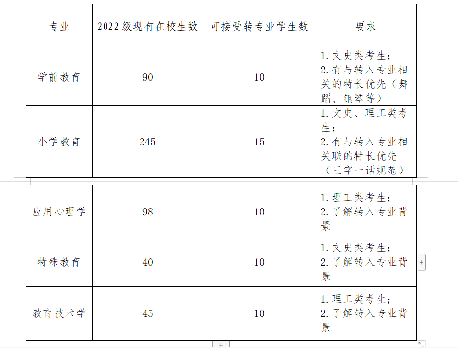 为更好地满足学生个人志趣,响应学校和顺应学院专业发展规划要求,充分调动学生学习积极性和主动性,经研究决定,教师教育学院2022-2023学年继续推行转专业工作。具体方案如下: