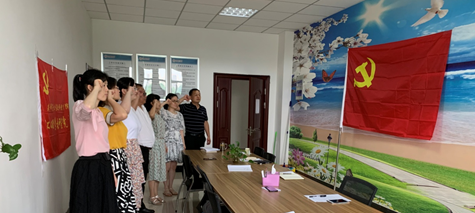 党课结束之后,在王皓宇的带领下,大家列队整齐,举起右手,在鲜红的党旗下庄严宣誓:我志愿加入中国共产党……永不叛党。十二句八十字的入党誓词,字字千钧,句句誓言,每一个字、每一句话,大家都诵读得十分庄重、认真。重温誓词的过程,也是大家重温使命,重新接受洗礼的过程。党性意识和党性观念在重温誓词的过程中得到了强化,思想境界得到了净化和提升。(撰稿:胡慧 摄影:张平 审核:陈志超)