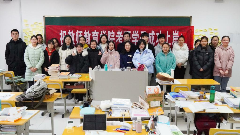 “百因必有果,所求皆所愿,考研加油!”“所有苦难与背负尽头,都是行云流水般的此世光阴。”“功不唐捐,玉汝与成,祝考研的学长学姐一切顺利。”……写有祝福语的50份考研大礼包摆放在课桌上,考研学子一一领取。拿到考研大礼包后,他们直呼学院简直太贴心了!领取学院准备的慰问品后,备考的学生们合影留念。