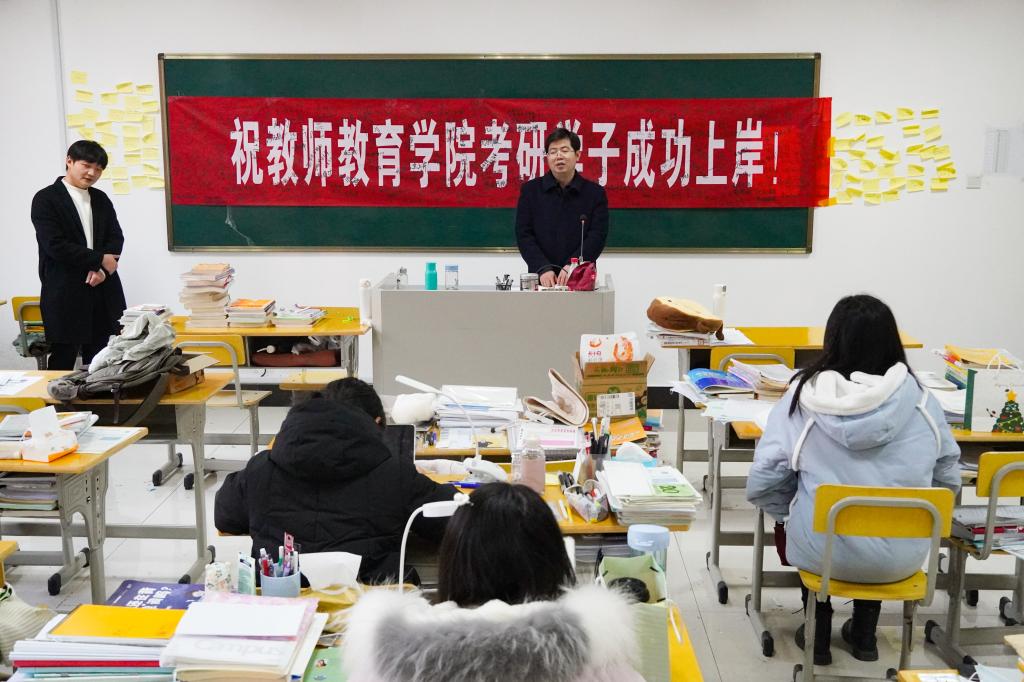 会上,陈志超指出,目前全国、学校、学院毕业人数增加、双减政策的实施以及疫情三因素导致学生就业形势严峻,因此,选择考研是提升自身就业层次和未来竞争力的一个非常好的途径,是非常明智的选择。陈志超希望学生们背负自信、激情与希望,坚持不懈,风雨兼程。他相信,不远的将来,学生们一定会迎来雨后的彩虹以及光辉的时刻,期待学生们马到功成,梦想成真。