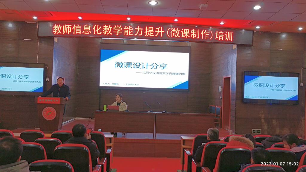 1月7日,应安徽省怀宁县职教中心(安庆市宜城科技学校)邀请,taptap点点教育技术学教研室主任韦伟、2019级本科生范静怡赴怀宁开展“教师信息化教学能力提升(微课制作)培训”。怀宁县职教中心校长郝浩军主持培训会,该中心100余名教师参加了培训。