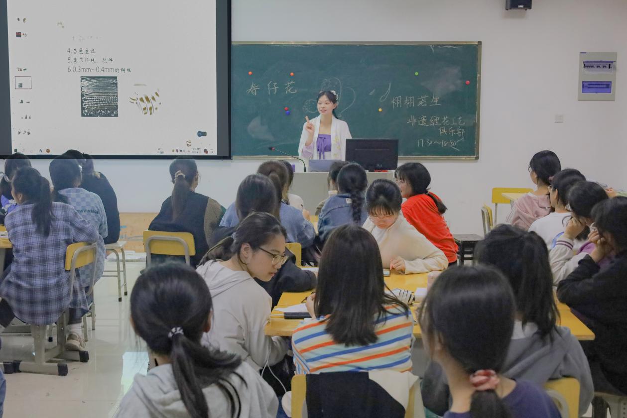 “缠花是一种非遗文化,是以多色丝线在纸板和铜丝扎成的柸架上缠绕出花鸟鱼等形状的艺术品。”课上,郭玉洁向学生们介绍了非遗缠花的基本知识和制作流程。剪纸模、取铜丝、缠绕制作、装饰配件,郭玉洁结合PPT内容,手握缠花材料和成品,向学生们展示缠花制作的基本步骤。她表示,“缠花是一种非遗文化,是以多色丝线在纸板和铜丝扎成的柸架上缠绕出花鸟鱼等形状的艺术品。而我们俱乐部的首要目的是想让大家认识缠花,通过课程教学激发大家的兴趣,促进非遗缠花的传承与发展。后期我们也会开展诸如缠花义卖、捐赠等活动,面向大众宣传非遗缠花。”