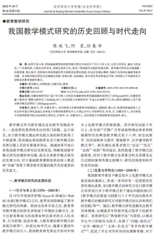 《我国教学模式研究的历史回顾与时代走向》指出改革开放以来,我国基础教育阶段教学模式研究大体经历了引介与本土化、反思与学科化、融合与信息化三个发展阶段,日渐走向科学化、系统化和多元化,推动了我国教学实践的快速发展。教学模式研究在内涵理解、价值澄清、特点探寻、类别划分和系统建构等方面取得显著的成就,但也存在理论薄弱、创新不足和目标偏狭等诸多问题。未来教学模式研究应沿循理论挖掘、系统比较、实验循证、技术优化等多种途径开展,共同致力于构建具有中国特色的素养型教学模式。