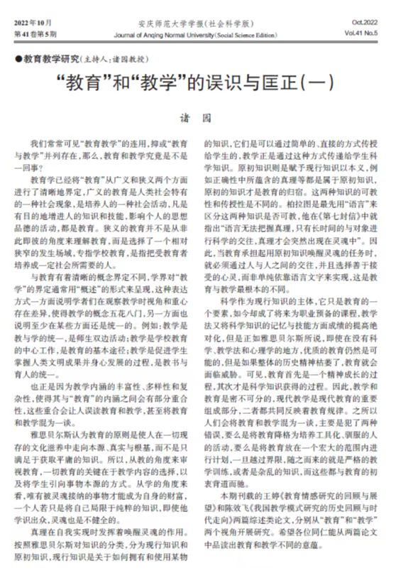《教育与教学的误识与匡正(一)》提出“教学”与“教育”的内涵之间有部分重合,这些重合让人误读教育和教学,甚至将教育和教学混为一谈。这主要是由于人们犯了两种错误,要么是将教育降格为培养工具化、驯服的人的活动,要么是将教育放在一个宏大的范围内进行计划,一旦越过界限,随之而来的就是严格的教学训练,或者是杂乱的知识。教育的任务是用原初知识唤醒灵魂,必须通过人与人之间的交往,并且选择善于接受的心灵,而非单纯依靠语言文字来实现,这是教育与教学最根本的不同。