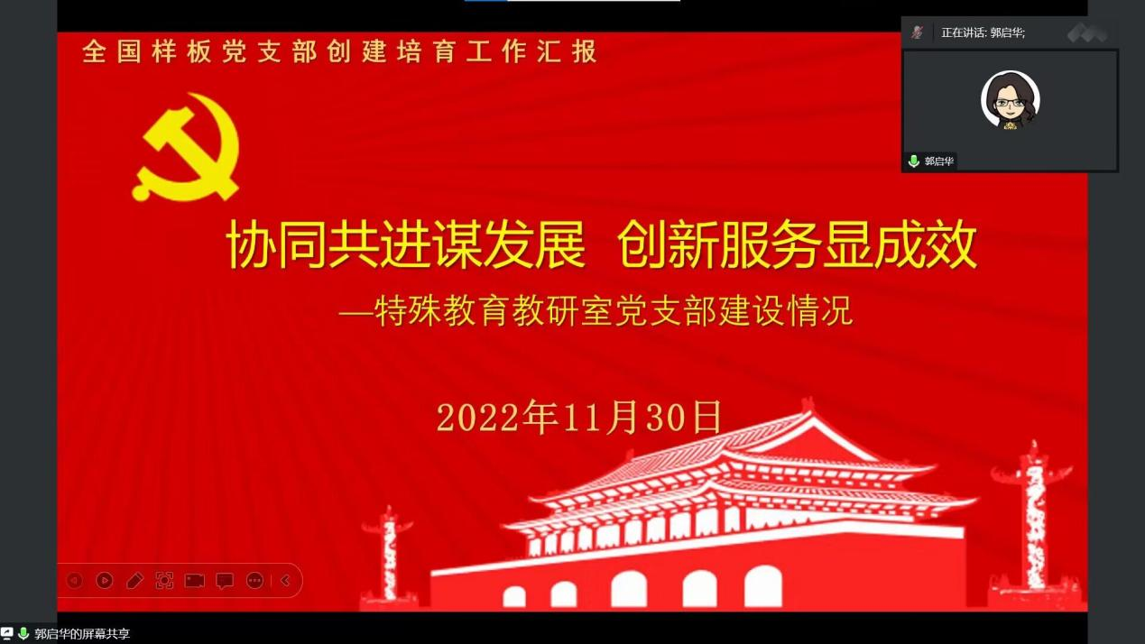郭启华围绕特殊教育教研党支部建设情况展开具体论述。她表示,两年多来,在校院两级党委的坚强领导和学校相关部门的悉心指导下,特殊教育教研室党支部对标新时代支部培育创建目标,立足党建与发展的互融共促,全面贯彻落实党的教育方针,聚焦“红色园丁”培育目标,在学院人才培养与建设发展中积极发挥作用,助力校地深度合作,为地方性应用型高水平大学建设提供了有力支撑。2019年12月,taptap点点特殊教育教研党支部获批为第二批“全国党建工作样板支部”培育创建单位,2022年7月顺利通过验收。