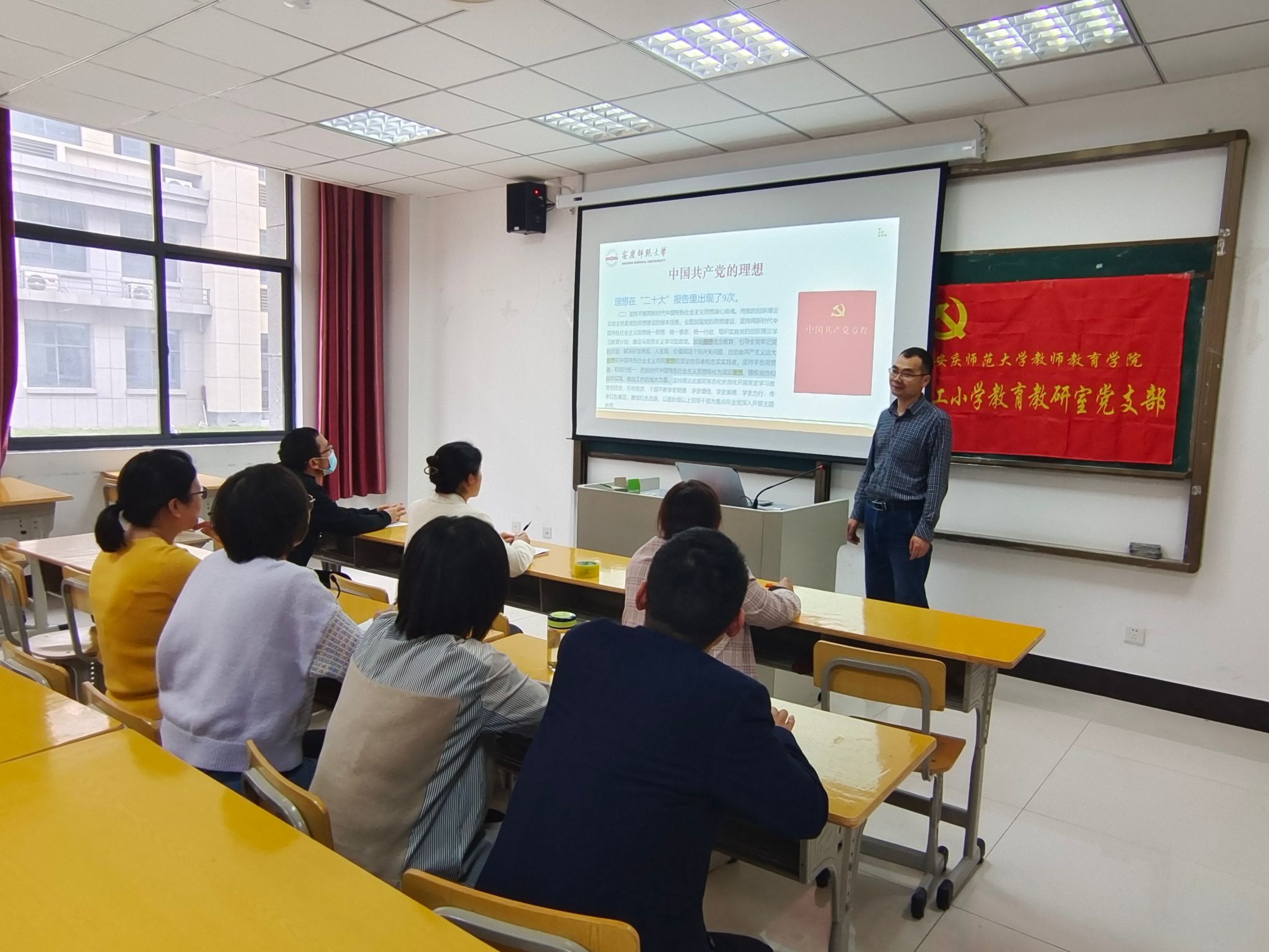5月24日, 小学教育教研室党支部书记陈效飞讲授学习贯彻习近平新时代中国特色社会主义思想主题教育专题党课,支部全体党员参加学习。