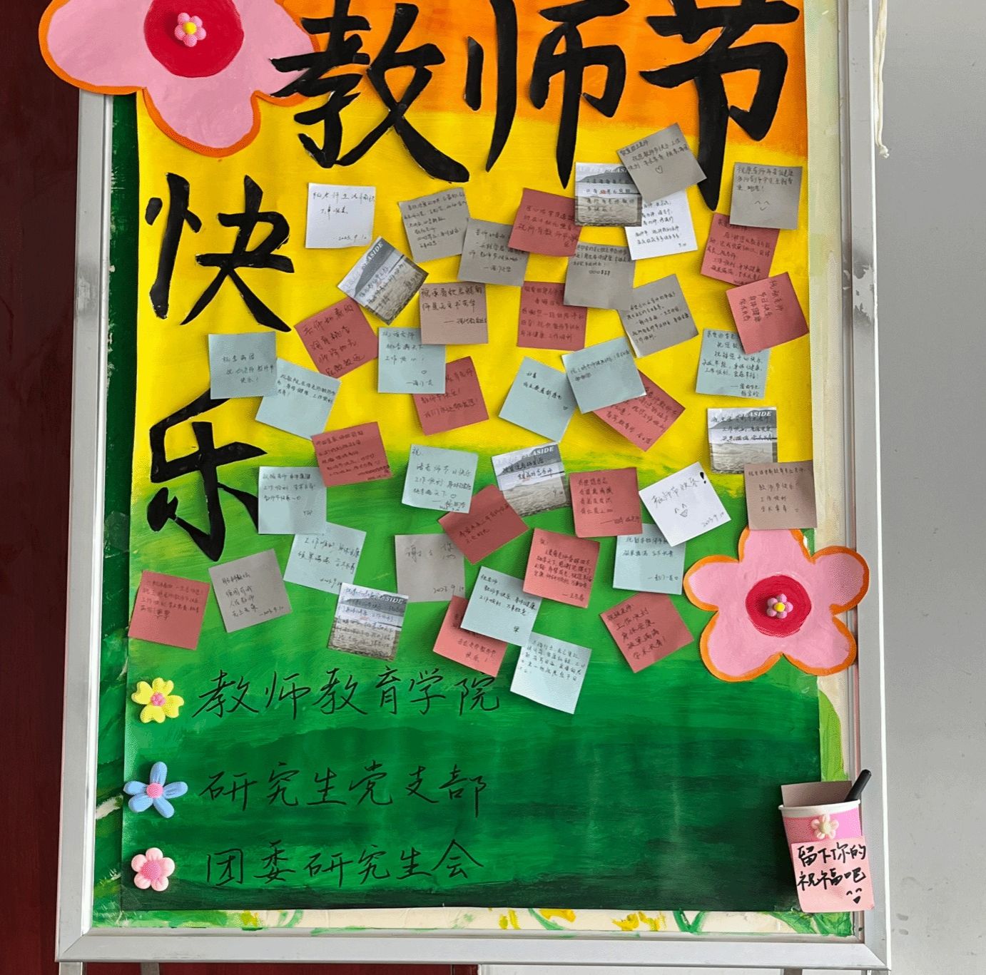 用爱培育爱、激发爱、传播爱,每一位老师正是用自己的热与爱浇灌学生,撑起一份情操,而往往这一撑,山一程水一程,便是一生。活动最后,同学们在留言板上写下对老师的祝福和感谢,“一朝沐杏雨,一生念师恩”“感谢老师叶的温暖,守护花的盛开”“您就像一束光,照亮我前行”。小小便签,承载了学生对老师的衷心感谢和温馨的师生情。