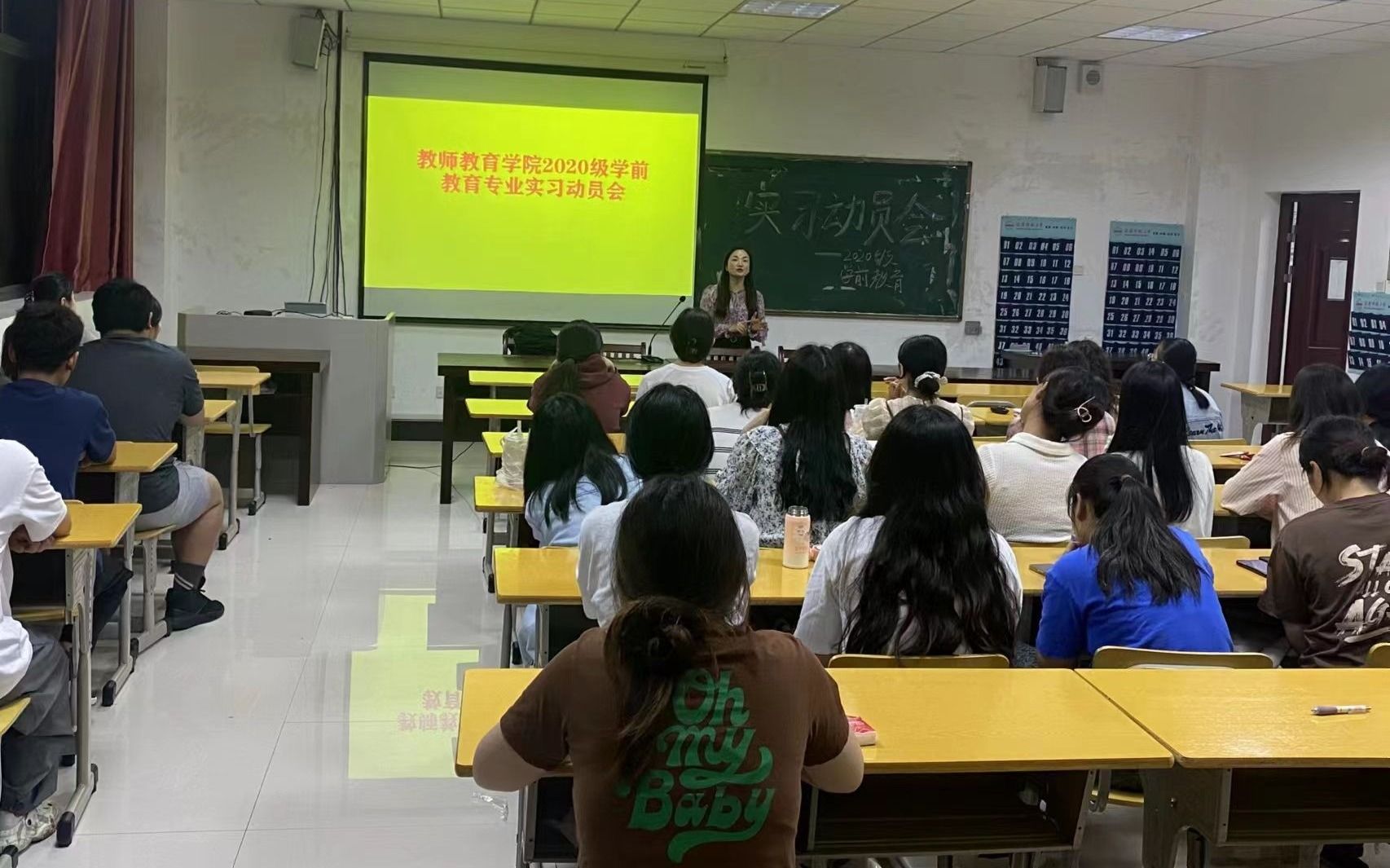 为积极引导2024届学前教育专业毕业生做好教育实习前的各项准备,推进教育实习工作的顺利开展,2023年9月25日晚,taptap点点2020级学前教育实习生在J305教室召开教育实习动员大会。学前教育专业负责人高向东、墨子巷幼儿园园长杨俊梅及学前教育教研室教师谢红玉参与了本次实习动员大会。