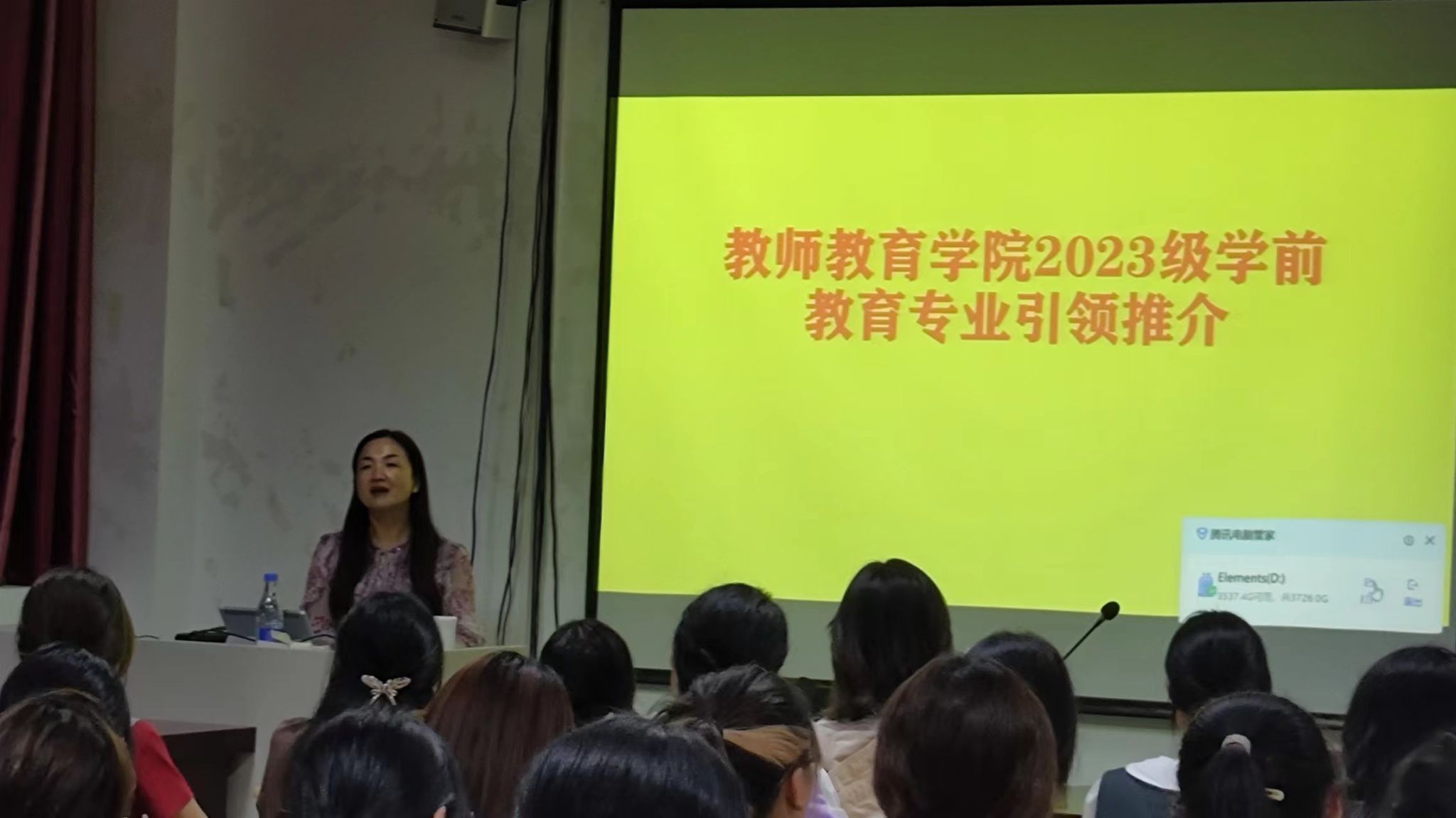 专业初识引领推介活动分为两个阶段,第一阶段是杨俊梅园长进行专业介绍和推介工作指导。杨俊梅园长通过启智教育引导,以“送被子”这一活动课程为案例,希望同学们要用正确的眼光来看待孩子的世界,杨园长还着重强调老师在孩子成长的过程中担任的重要角色。会议第二阶段,由2023级学前专业新生与杨园长进行专业互动,杨园长不仅做出的详细的讲述和分析,还向同学们介绍了学前教育专业本科生的去向,希望同学们明确自己的定位,朝着目标不断前进。