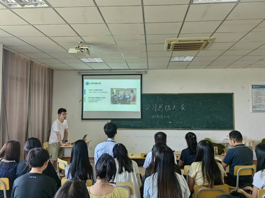 在汇报环节,多位2023级研究生代表依次上台进行精彩分享,李忠辉展示了在安庆高等医药专科学校的实习经历与成果,参与了多场听课以及备课以及校园彩虹跑活动;吴泽安分享了于安庆职业技术学院实习的独特体验与收获,参与了他校外导师的课程教学;程文彦代表团队详细汇报了在安庆市第六人民医院的工作情况,涵盖科室实践、个体咨询技巧、团体辅导经历,并重点介绍了精神病患者分类知识及临床经验的学习;张鑫洁代表小组分享了在安庆市第一中学的实习心得,特别介绍了深度参与并收获颇丰的“5·25心理健康月”系列活动组织经验。