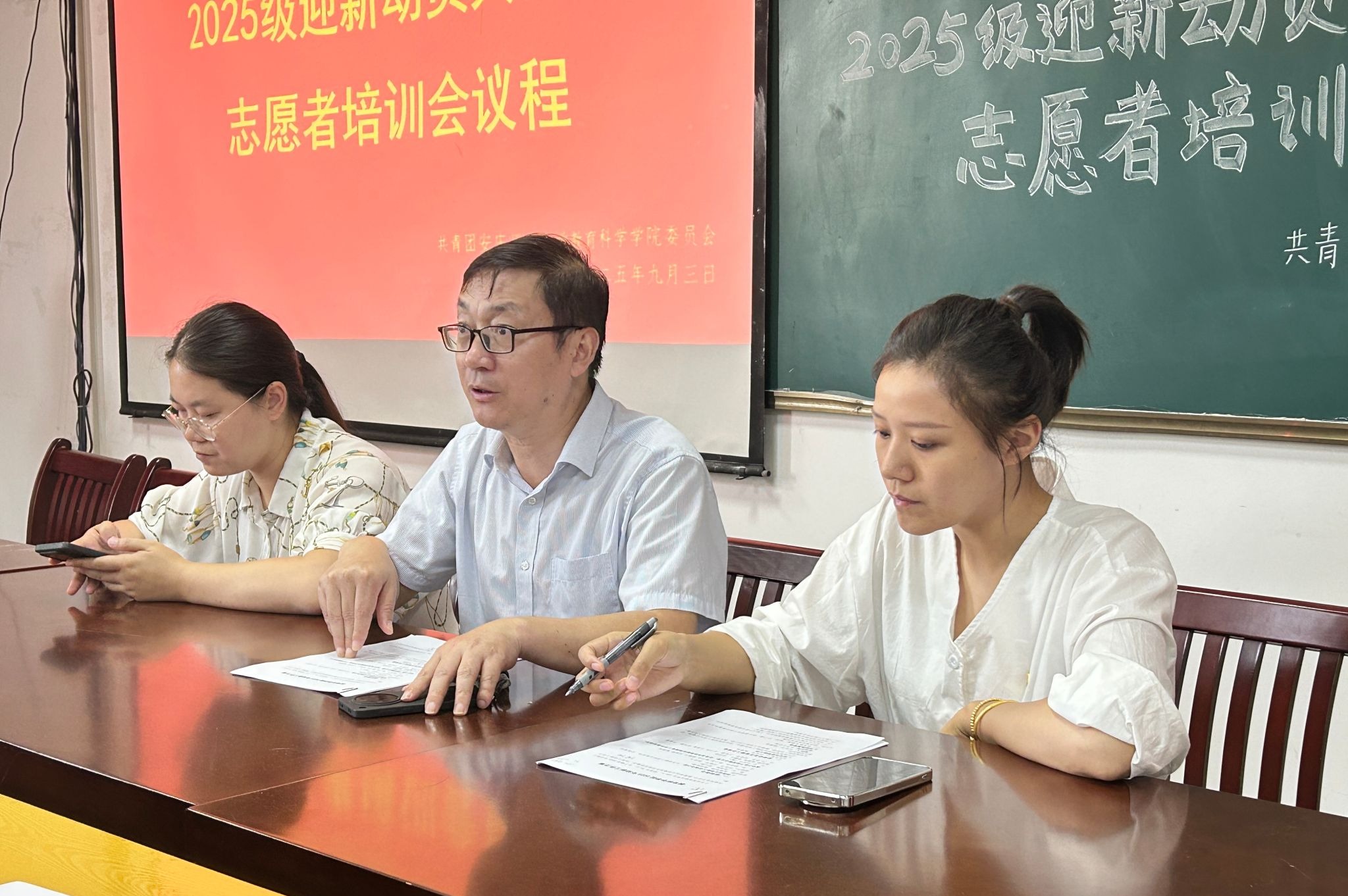9月3日,taptap点点于J305教室开展2025级迎新动员暨志愿者培训会。院党委副书记许世平、团委副书记姚强诚、新生辅导员郭静文出席,全体迎新志愿者到场。