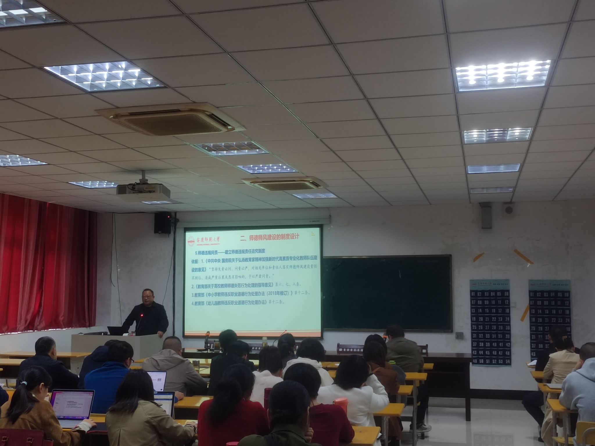 院长吴云助解读了师德师风建设有关文件精神,介绍了教师职业行为细则和违反教师职业行为的具体负面清单,对强化师德师风建设提出具体要求。一是强化思想引领,通过专题学习、师德讲堂等形式,深入学习习近平总书记关于教育的重要论述和师德典范事迹,筑牢思想根基;二是健全管理制度,完善师德考核评价机制,将师德表现与职称评定、评优评先、绩效分配等直接挂钩,形成正向激励与约束机制;三是搭建实践平台,组织开展师德师风主题实践活动,鼓励教师深入一线教育场景,在实践中锤炼师德修养。