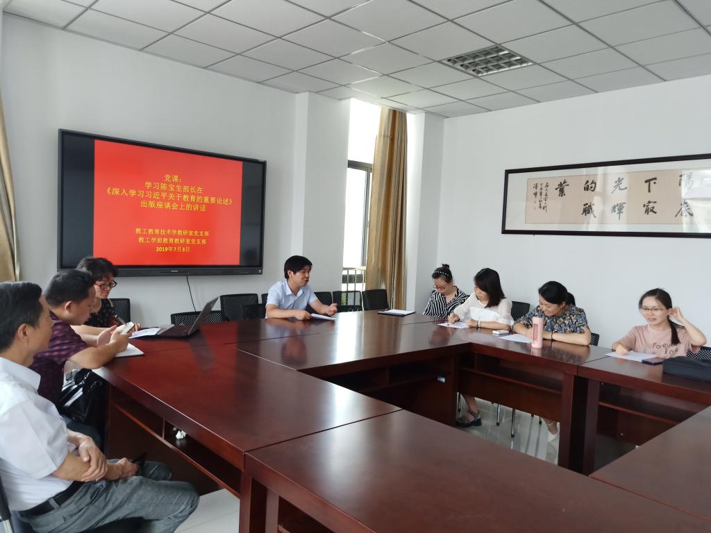 为认真学习陈宝生部长在《深入学习习近平关于教育的重要论述》出版座谈会上的讲话,7月3日中午,taptap点点官方网站教工教育技术学教研室党支部和教工学前教育教研室党支部在J202会议室开展“学习陈宝生部长在《深入学习习近平关于教育的重要论述》出版座谈会上的讲话”专题党课学习活动。此次党课由taptap点点官方网站副院长汪洋主讲,两个教工支部的党员聆听党课。