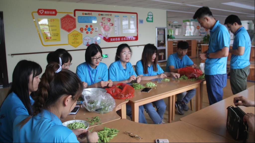 “来,我们一起为孩子们准备毛豆”,午餐时间将至,值班队员们围坐在桌子前,为孩子们准备新鲜的食物原材料,并且为每一位孩子盛好饭菜、摆放餐具。每一个桌前配备固定志愿者,照顾孩子们安全有序的进餐,这是队员们的工作日常,看似简单,实则需要付出的不仅仅是责任心,更是一份耐心。