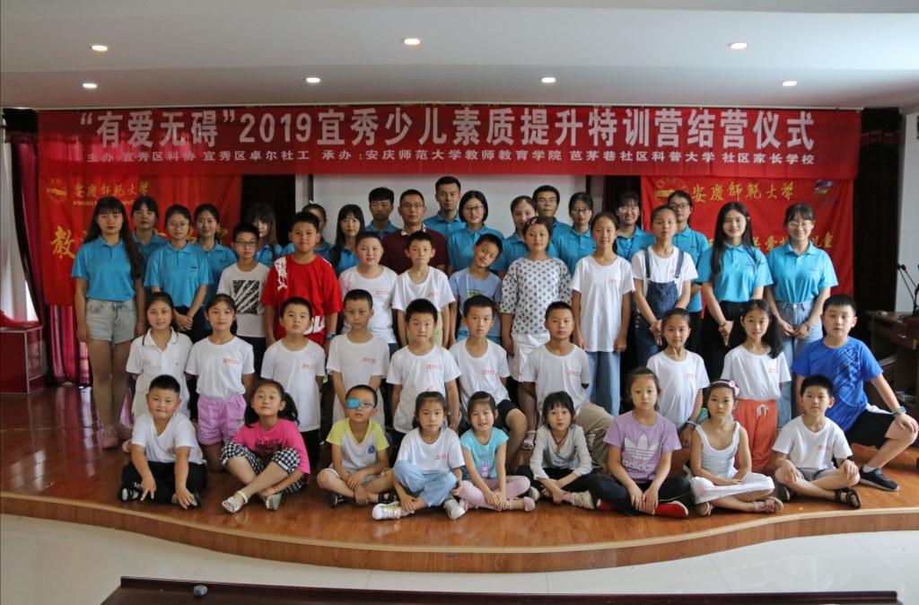 7月14日上午,经过为期七天的特训生活,“有爱无碍”2019年宜秀少儿素质提升特训营在安庆芭茅社区活动中心正式落下帷幕。宜秀区科协副主席李勇、taptap点点官方网站taptap点点官方网站老师陈安定、芭茅巷社居委领导宣庆之、宜秀卓尔社工理事长王奎以及特训营的学生、家长、20名志愿者参加了此次结营仪式。