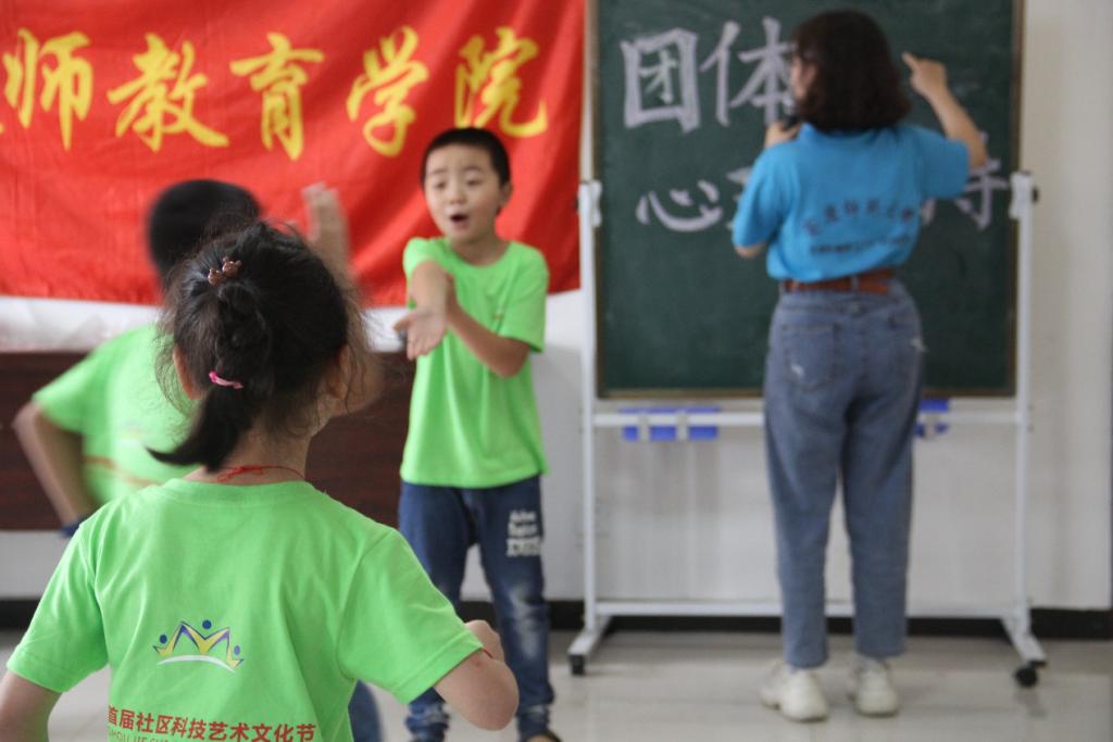 活泼好动是孩子的天性。伴着7月15日的上课铃声,68名小朋友端坐在芭茅巷社区的会议室里,下午这些孩子被分成两班,开始了他们期待已久的开学第一课。为了使他们彼此认识,打开交流的“大门”,志愿者们决定以“萝卜蹲”“卖西瓜”等小游戏为载体,帮助他们记住同学们和支教老师的名字。