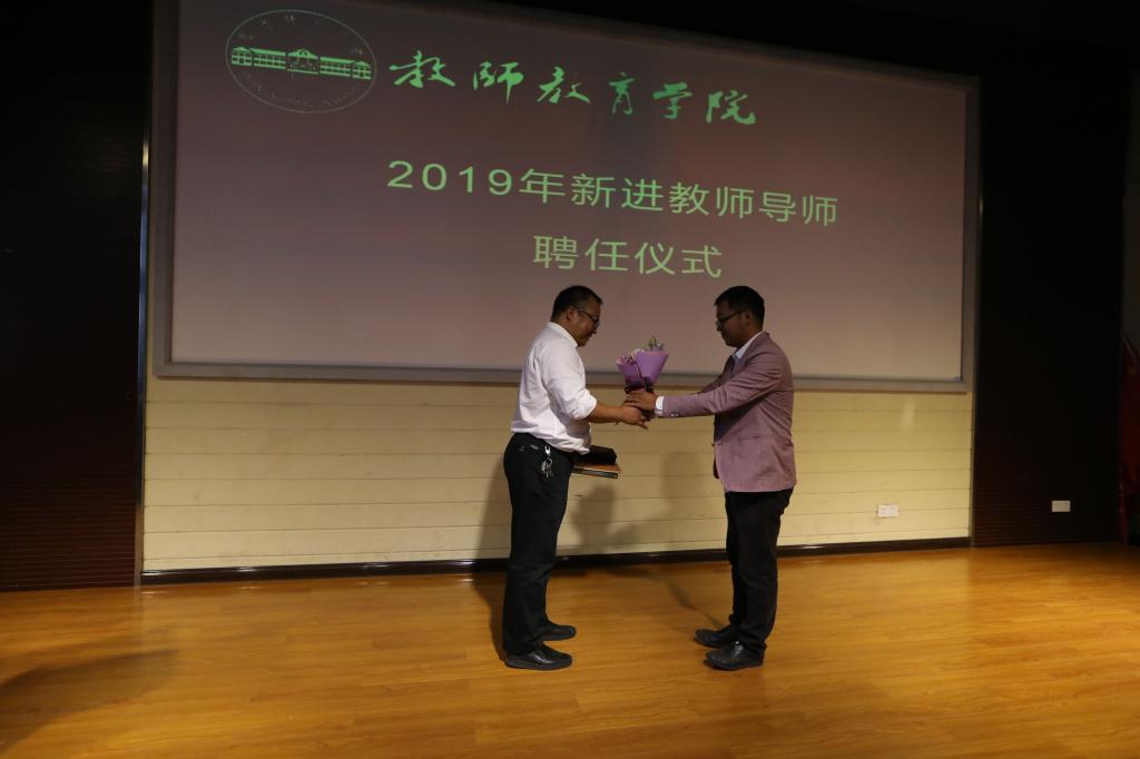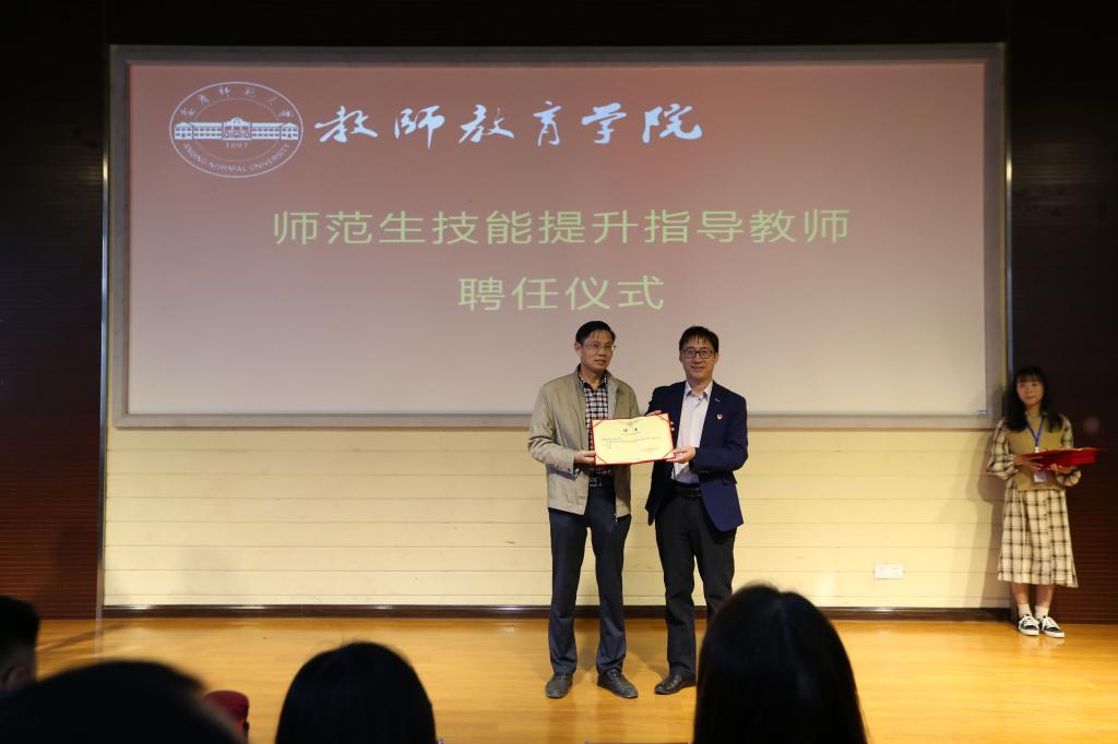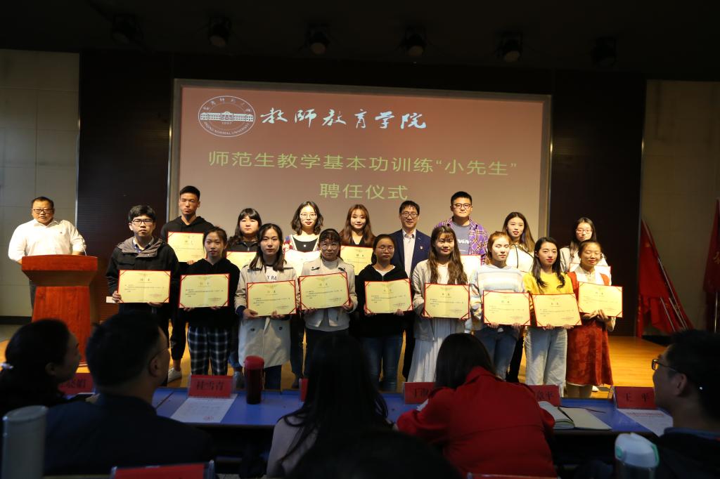 聘任仪式共分为四个部分,一是为推行师范生教学基本功训练“小先生”制,聘请彭呈芳等17位同学为“小先生”的仪式;二是为强化专业教师指导与引领,提升师范生从教技能,聘请林柏峰等16位老师为师范生技能提升指导教师的仪式;三是为加强学科教学论青年教师队伍建设,聘请丁淑贞等10名老师为学科教学论青年教师导师的仪式;四是为加强学院青年教师队伍建设,聘请郭启华等3名老师为学院2019年新进青年教师导师的仪式。