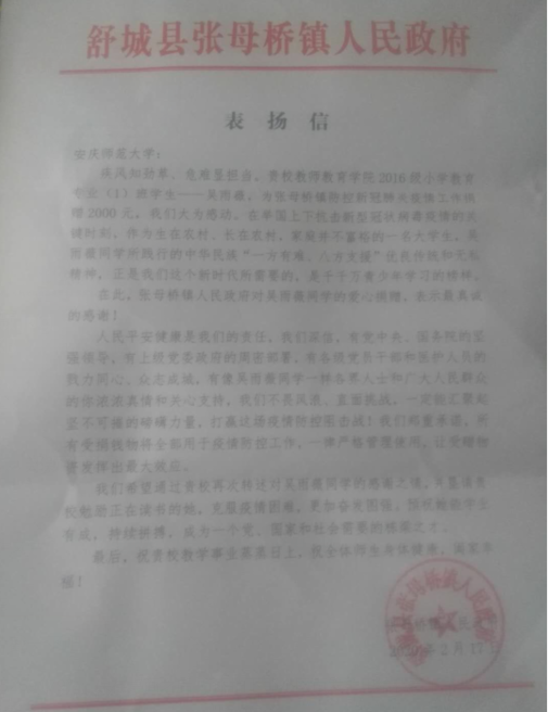 大学生们的志愿工作得到了社会的肯定,更是有人收到了家乡送去的表扬信。六安市舒城县张母桥镇人民政府便专门为在此积极参加疫情防控工作的大学生吴雨薇送来的表扬信。