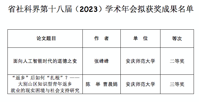 近日,以“谱写中国式现代化的安徽篇章”为主题的安徽省社科界第十八届(2023)学术年会公布了获奖成果名单。公共教育学教研室张峰峰老师的《面向人工智能时代的道德之变》荣获二等奖,陈举老师及研究生曹晨娟的《“返乡”后如何“扎根”?——大别山区知识型青年返乡就业的现实困境与社会支持研究》荣获三等奖。