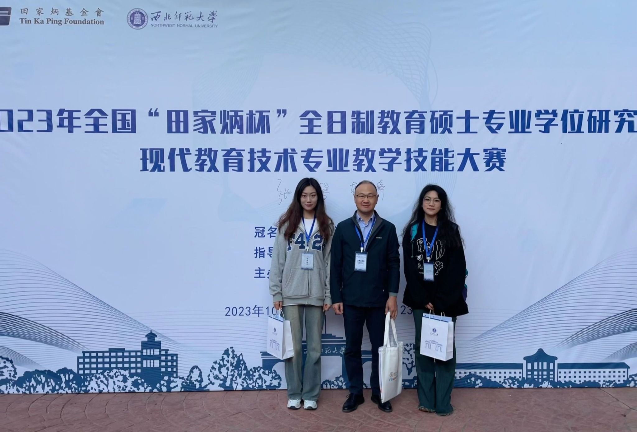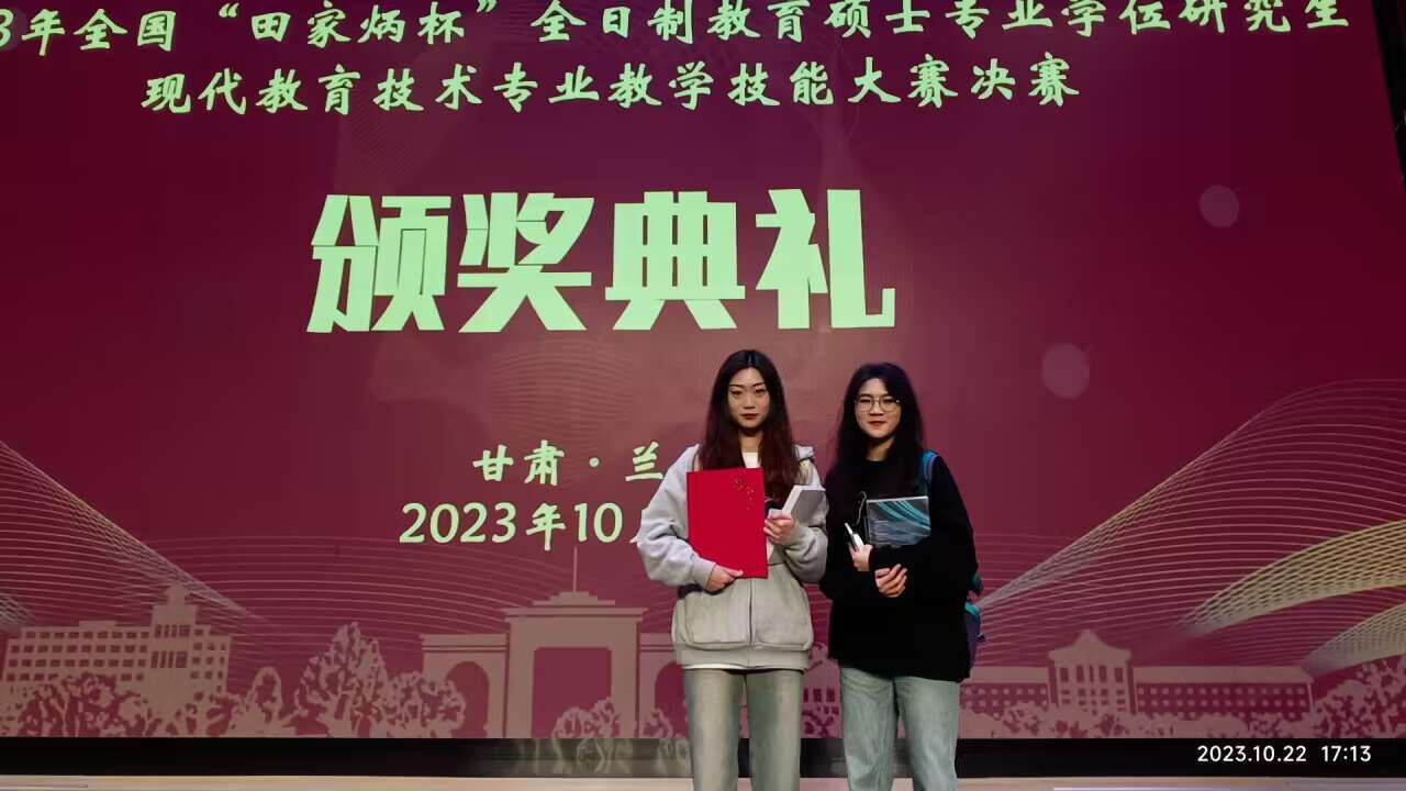 10月20日-22日,2023年全国“田家炳”现代教育技术专业教育硕士教学技能大赛决赛在甘肃兰州西北师范大学举行。教育技术系前期推选现代教育技术专业5名研究生参加初赛,经大赛初赛评审专家评审,由刘萌萌、韦伟指导的张盈馨(2021级)、郝静婷(2022级)入围决赛并赴西北师范大学进行现场评比。指导教师韦伟陪同前往。