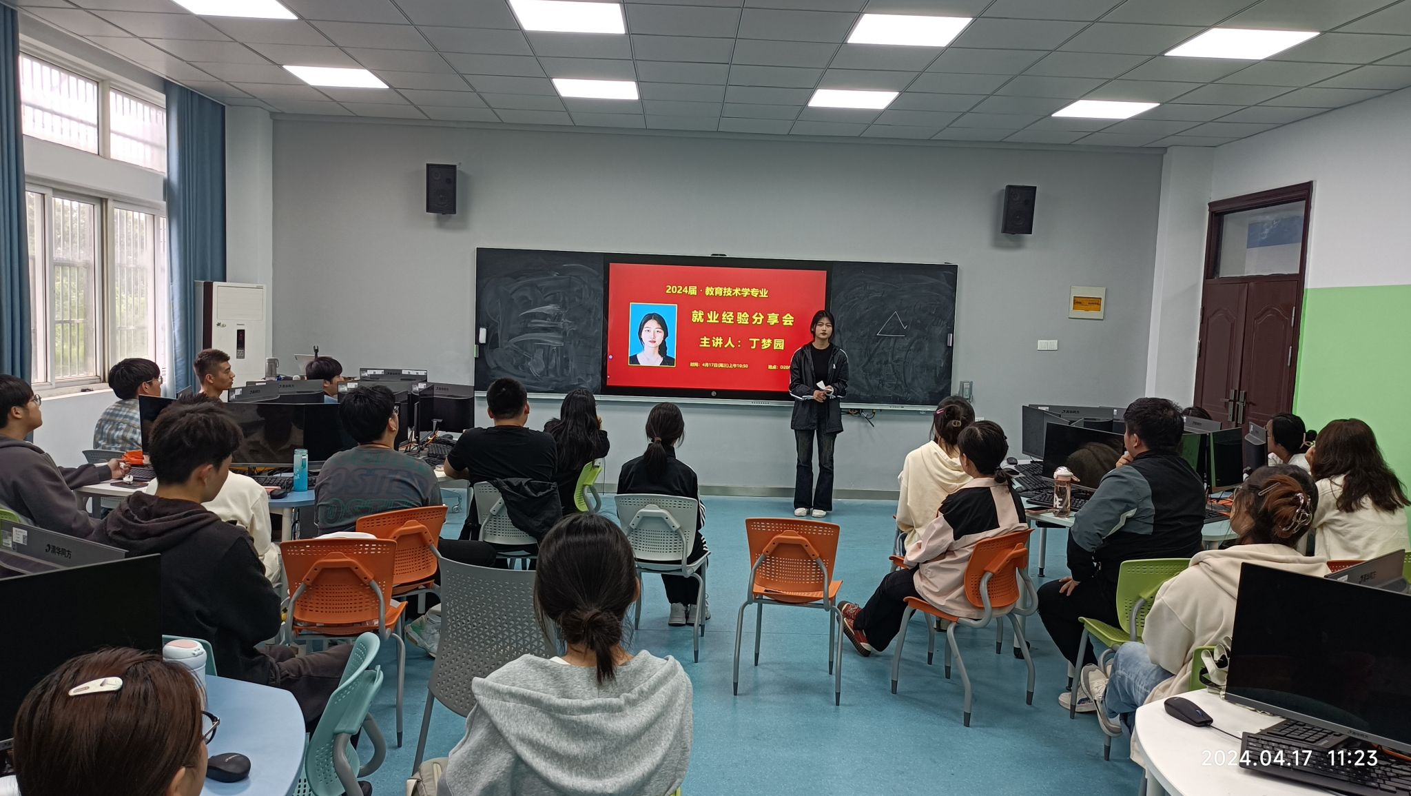 2024年4月17日,taptap点点官方网站教育技术系在D206教室举行毕业生就业经验分享交流会。教育技术学2024届毕业生代表丁梦园担任主讲,2021级全体学生参加。活动由系主任韦伟主持。