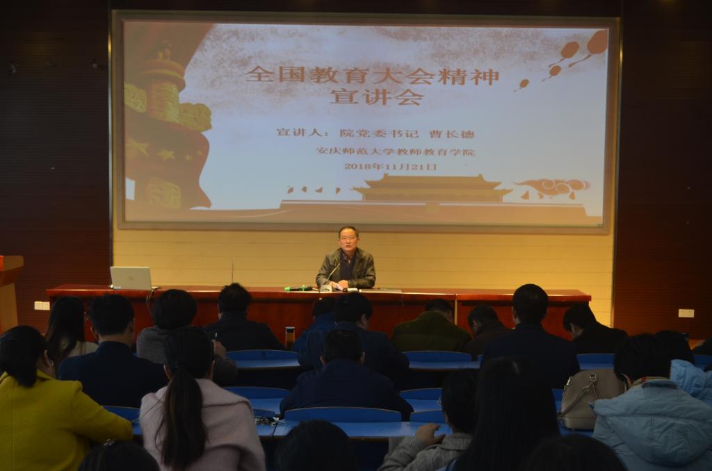 最后,曹长德向全院师生提出希望和要求,一要高度重视,领会精神,在思想上必须与大会精神保持高度一致,做好教育科研各方面工作;二要深刻理解和把握培养德智体美劳全面发展的社会主义建设者和接班人的目标方向,把立德树人的根本任务落到实处;三要加快内涵建设,突出教师教育特色,以全国教育大会精神为指导,开创教师教育学院发展新局面。