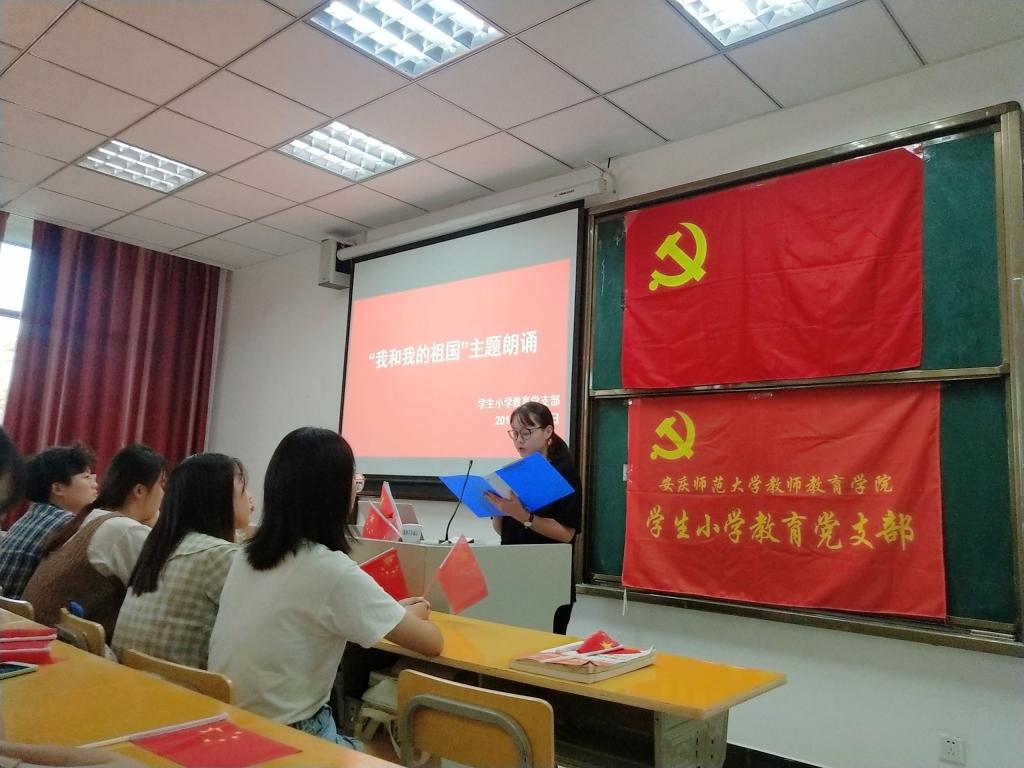 9月29日下午,学生小学教育党支部全体成员在支部书记后娇娇老师的组织及带领下于J219教室开展以“我和我的祖国”为主题的党日活动。红旗飘飘、歌声激昂,此次活动是为了在国庆这一重要节日来临之际庆祝新中国成立70华诞,激发大家的爱国情怀。