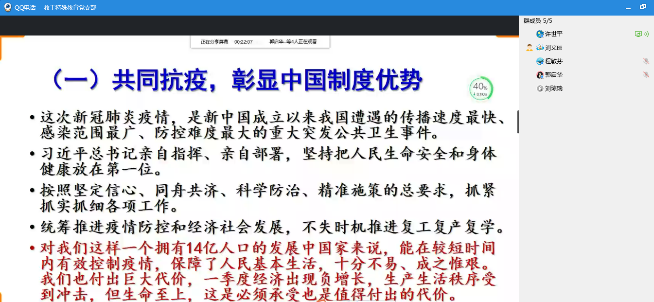 6月30日下午,学院党委副书记许世平在会议室J202进行了题为“学习领会2020年‘两会’精神”的主题党课,教工特殊教育教研室党支部和机关党支部的所有教工党员参与学习,此次党课采取线上线下相结合的方式进行。