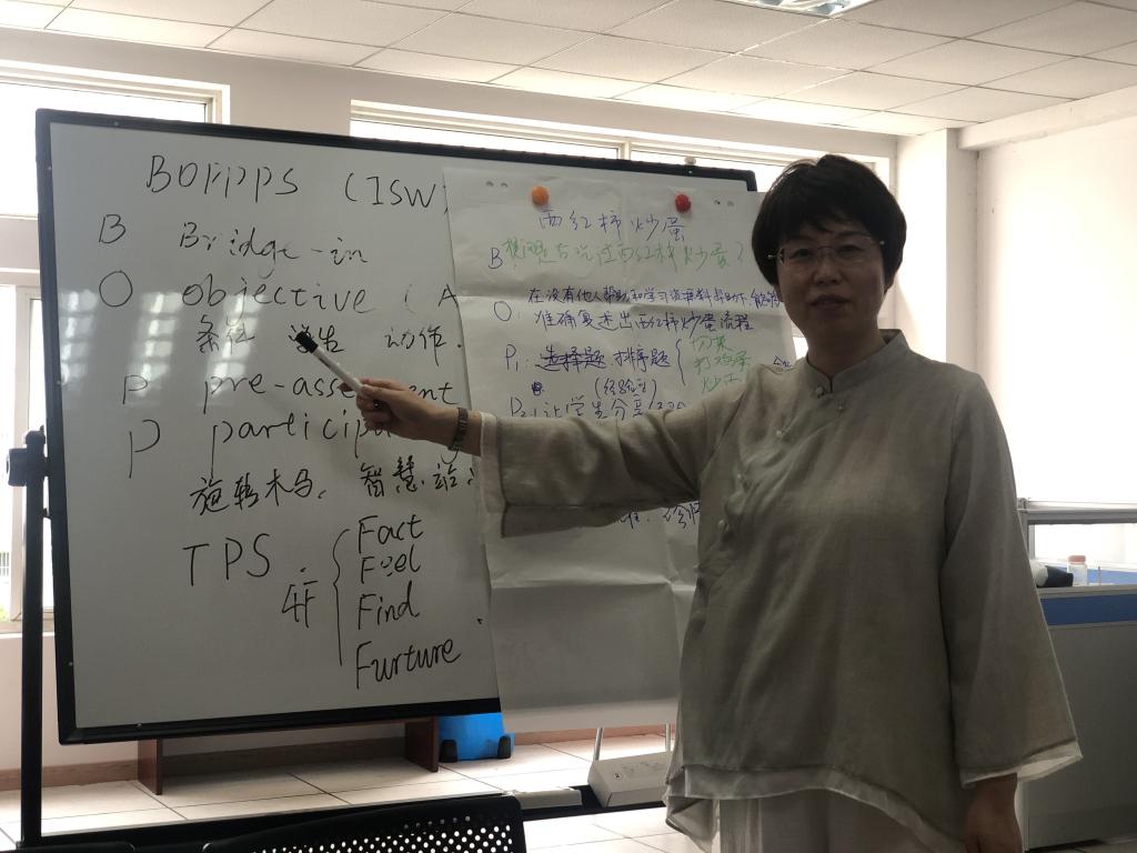 在第一阶段,刘老师首先汇报了赴北京参加ISW培训的基本情况,并与大家分享基于BOPPPS模型的教学设计方法与实践。该模型包括引入(Bridge-in)、目标(Objective)、前测(Pre-assessment)、参与式学习(Participatory learning)、后测(Post-assessment)和小结(Summary)六个模块,简称为BOPPPS。刘老师详细介绍了BOPPPS教学结构各个环节的内涵,分析了旋转木马、智慧站点、So-What、TPS、4F、两端测试等方法的形式和优缺点。