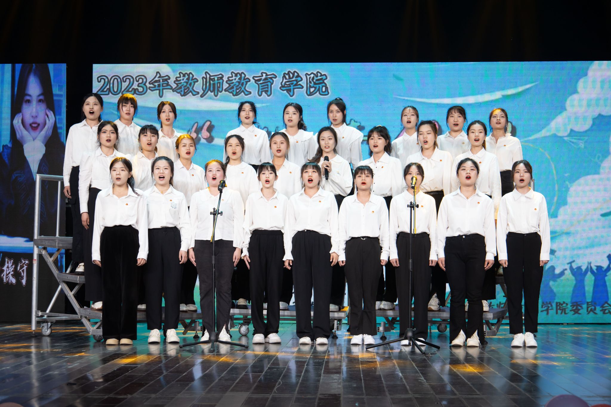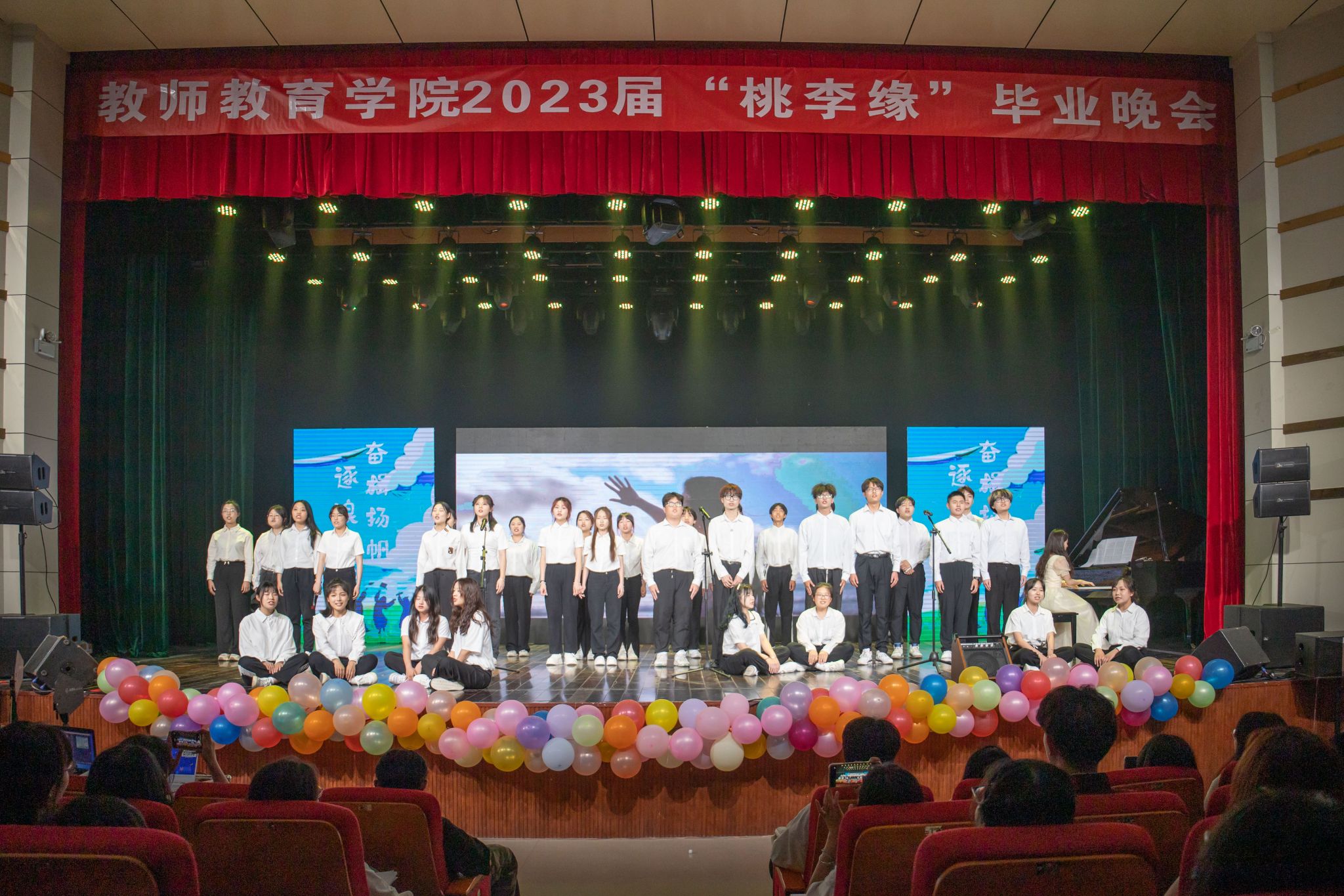 “我们懂得学习的理由,活出生命的精彩才无愧于春秋……”在悠扬舒缓的歌声中,现代教育技术专业2021级的研究生张晓睿等人带来的合唱《大学问》将晚会带入尾声。她们在歌曲中寄托了对毕业生们的祝福,“愿他们能够奋勇当先,实现人生价值。”