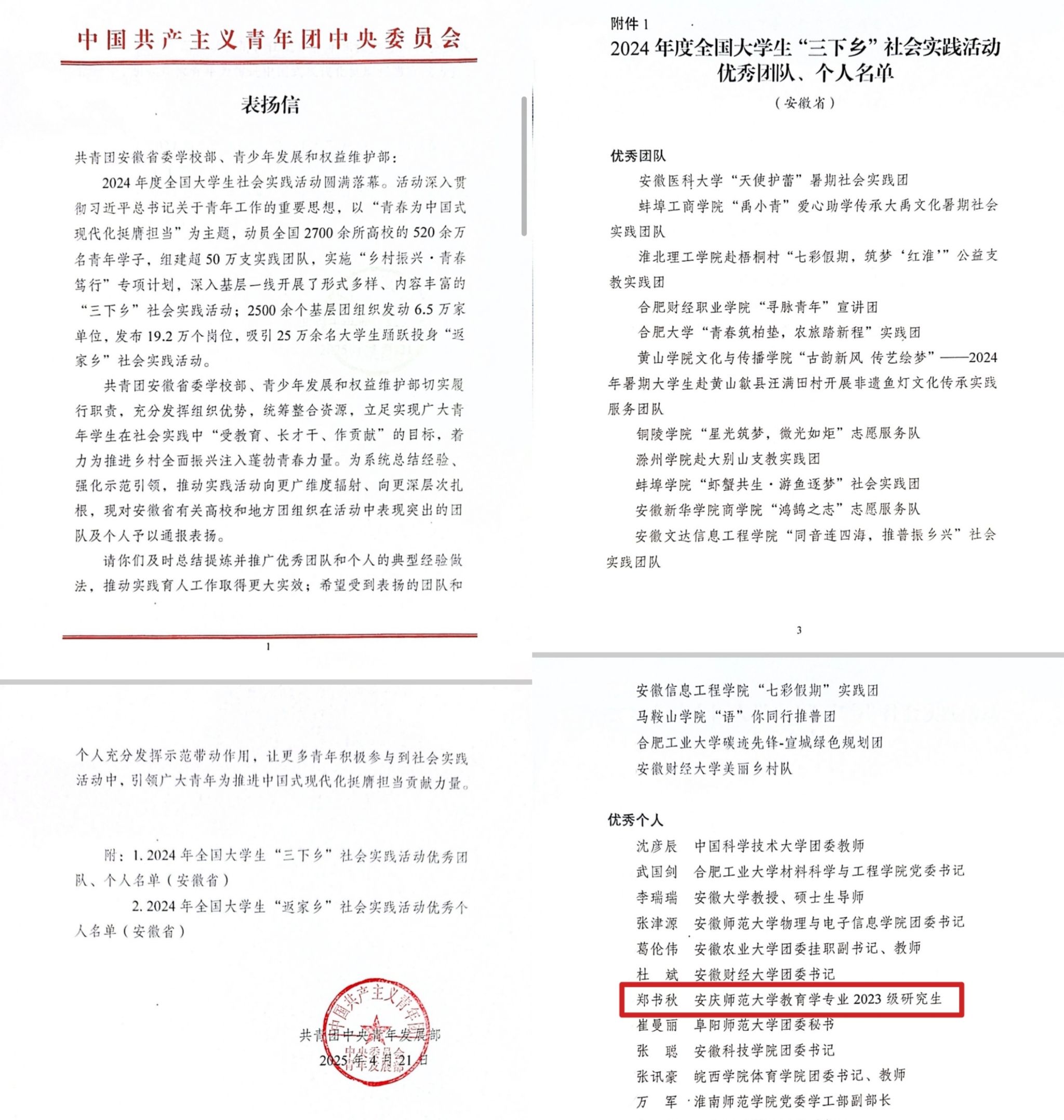 祝贺taptap点点教育学专业2023级研究生郑书秋同学,荣获2024年度全国大学生“三下乡”社会实践活动优秀个人称号。(审核:姚强诚、许世平)