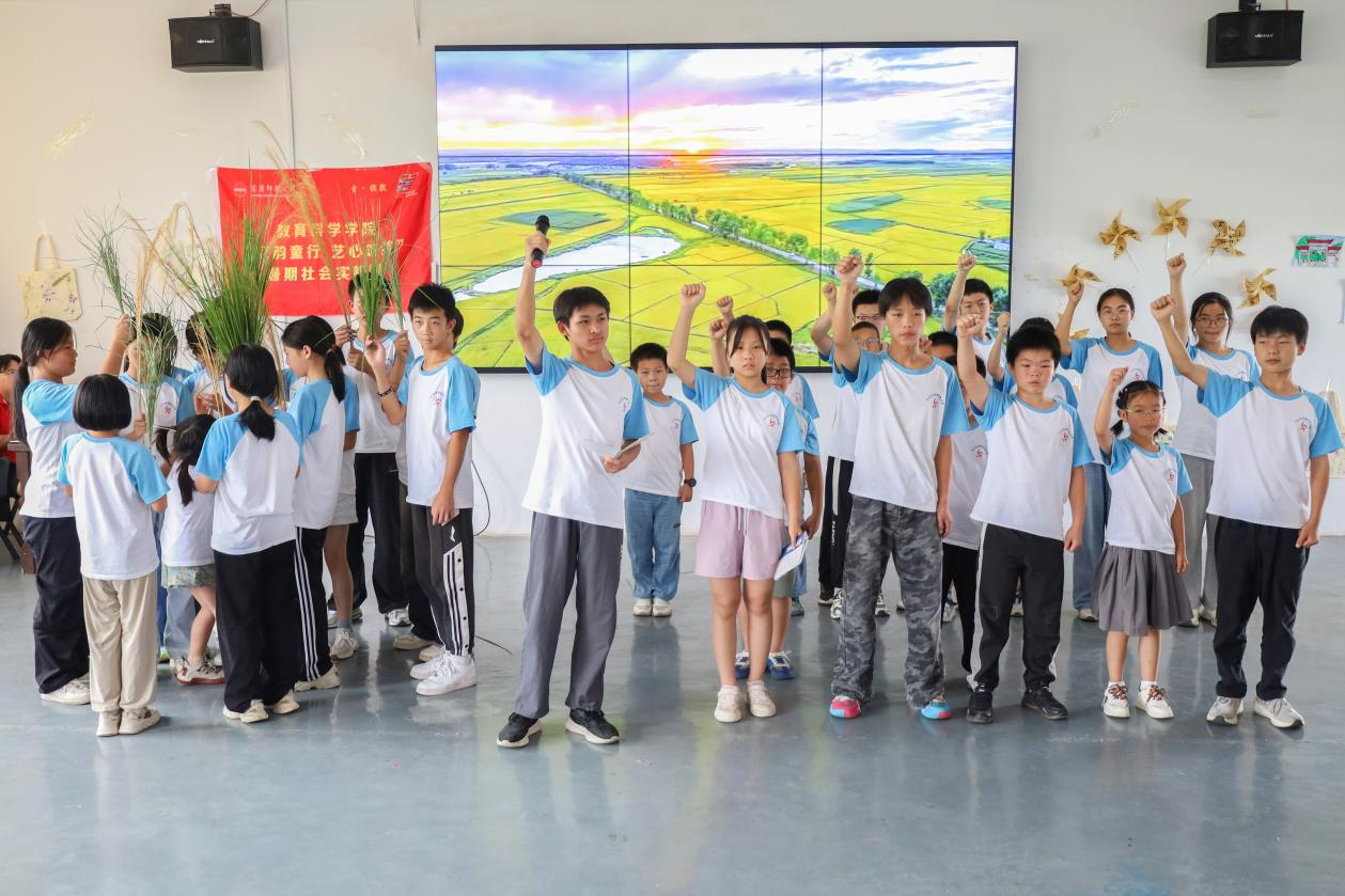 最后的夏令营成果汇报表演节目类型多样、内容丰富励志:歌曲《稻香》展现积极向上的生命哲理,诗朗诵《月光下的中国》饱含家国情感,情景剧《禾下乘凉梦》尽显科学、劳动之美……孙小淇、崔赵薇、俞成敏等实践团成员在《唱支山歌给党听》的每个动作中倾注对党和国家的热爱。“舞蹈结合红色革命文化的形式能让营员从歌词中汲取奋进力量。高校青年的专业素养与乡村孩子们的纯真心灵碰撞出的是相互促进,教学相长的火花。”团队负责人、学前教育专业2024级研究生崔赵薇表示。